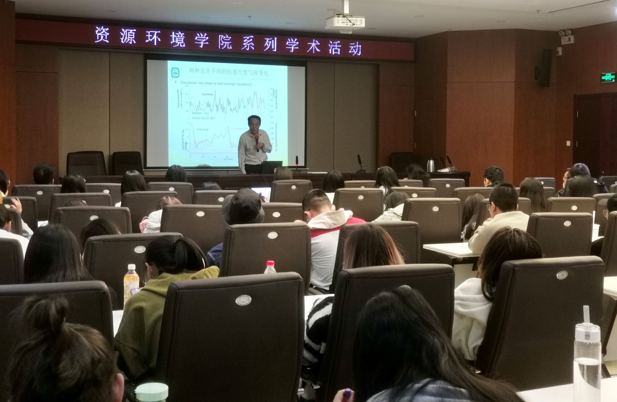 报告中,汪教授围绕气候变化档案库,系统地介绍了海洋、黄土、冰芯、石笋、树轮、珊瑚、湖泊沉积物、砗磲以及历史文献等多种气候记录载体。汪教授通过生动的故事和丰富的研究案例为大家详细讲述了每种气候记录载体的研究历史、测年原理和采样方法,以及每种载体在时间或空间尺度方面的适用范围。报告结尾,多位老师和同学就该领域的热点和难点问题与汪教授进行了深入交流,现场氛围热烈。
