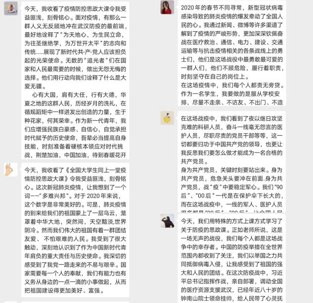 课程直播结束后,太阳集团tyc33455本科生、研究生各年级辅导员组织学生,通过网络线上会议,对本次“思政大课”进行了更进一步的学习、讨论与交流。同学们积极参与,纷纷发言表态。2017级研究生文亮同学表示:“此次疫情防控据阻击战让我们真切地感受到了中国速度、中国精神与中国力量,一句重托,十四亿华夏儿女众志成城、同舟共济、共克时艰,这是制度优势的彰显,是共产党人的磅礴伟力,是中华民族消灭病毒、打赢疫情防控阻击战的底气!”2019级本科生崔耀文同学表示:“面对疫情,我们每个人都应将悲而不愤、忧而不惧、善待同类、劫后余生,这四个词铭记于心,作为新时代青年,每一位“逆行”的天使都是学习的榜样。”2017级本科生李齐欢同学表示:“对于疫情防控,磨难压不垮,奋起正当时,无数的追光者们在国家和人民最需要的时候做出无怨无悔的选择,她们用最美的身影诠释生命的意义,我们要对疫情防控坚定信心、不负韶华。”