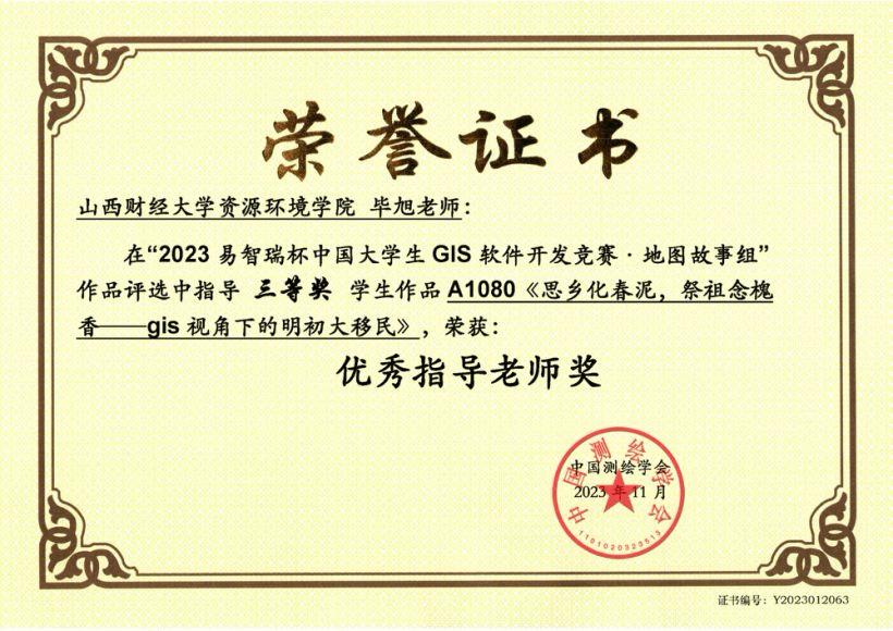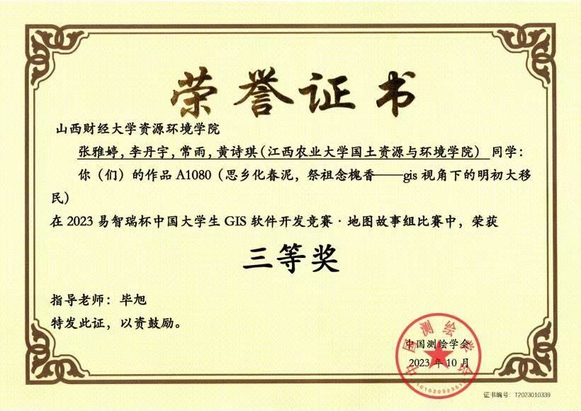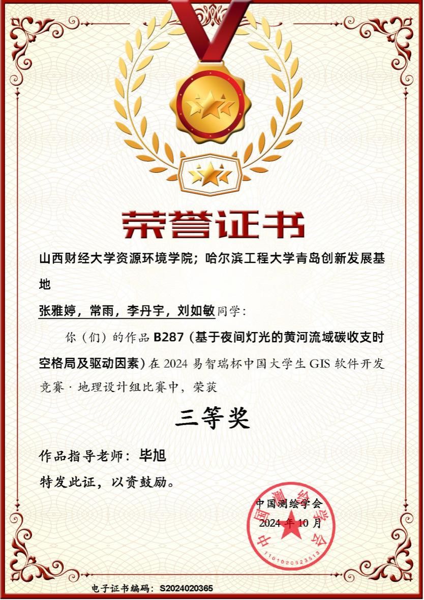 2024年“易智瑞杯”中国大学生GIS软件开发竞赛评选结果正式揭晓!太阳集团tyc334552021地理信息科学专业张雅婷、常雨、李丹宇三位同学的作品《基于夜间灯光的黄河流域碳收支时空格局及驱动因素》荣获地理设计组三等奖。其中,该团队成员在2023年“易智瑞杯”中国大学生GIS软件开发竞赛中作品《思乡化春泥,祭祖念槐香——gis视角下的明初大移民》荣获地图故事组三等奖。以上荣誉不仅是对团队成员辛勤付出的肯定,更是对我院在培养高素质GIS人才方面所取得成绩的认可。指导教师毕旭老师荣获“优秀指导老师”奖项,她的专业指导和无私奉献为团队成功奠定了坚实的基础。