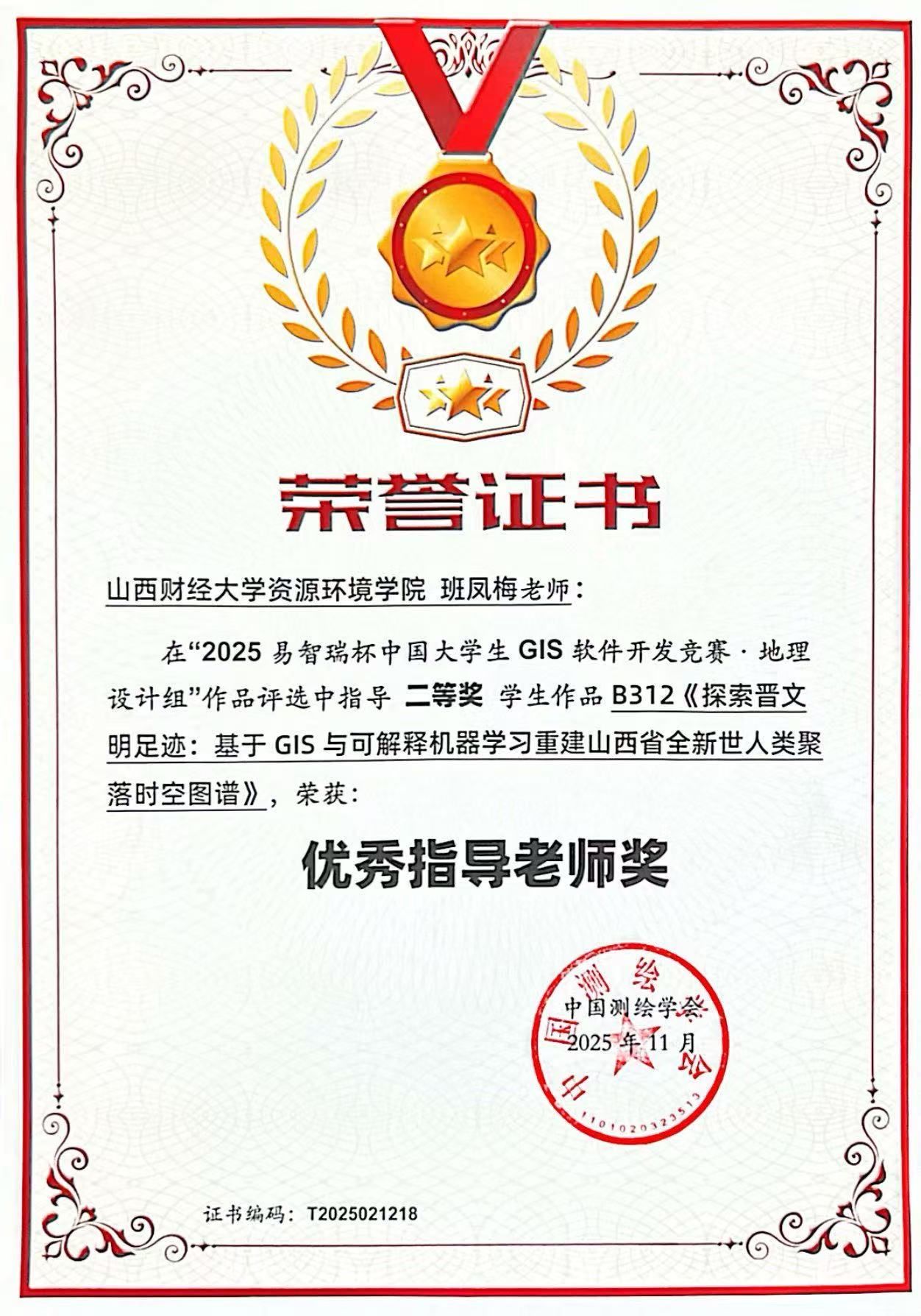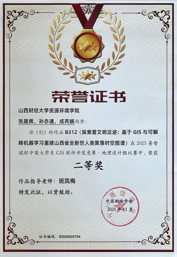 近日,2025年“易智瑞杯”中国大学生GIS软件开发竞赛圆满落幕。本届竞赛作为中国GIS领域最具影响力的创新型赛事,数千名优秀学子同台竞技,太阳集团tyc334552023自然地理与资源环境班张晟辉、孙亦通,2022自然地理与资源环境班成芮娴三位同学表现优异,团队参赛作品《探索晋文明足迹:基于GIS与可解释机器学习重建山西省全新世人类聚落时空图谱》,凭借扎实的研究基础与创新的技术融合,在全国众多参赛作品中脱颖而出,荣获地理设计组全国二等奖,作品指导老师班凤梅教授荣获“优秀指导老师”奖。