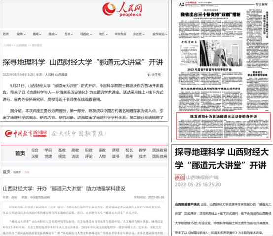近日,人民网、山西晚报、中国教育新闻网、山西科技报等多家媒体平台对我院“郦道元大讲堂”进行了转载和报道,这将明显提升此次大讲堂的影响力,让更多学者大众参与其中,为地理科学的知识科普宣传提供窗口和平台,同时对提升我院办学的影响力,助力我院学科建设和招生工作等方面起到积极的宣传作用。