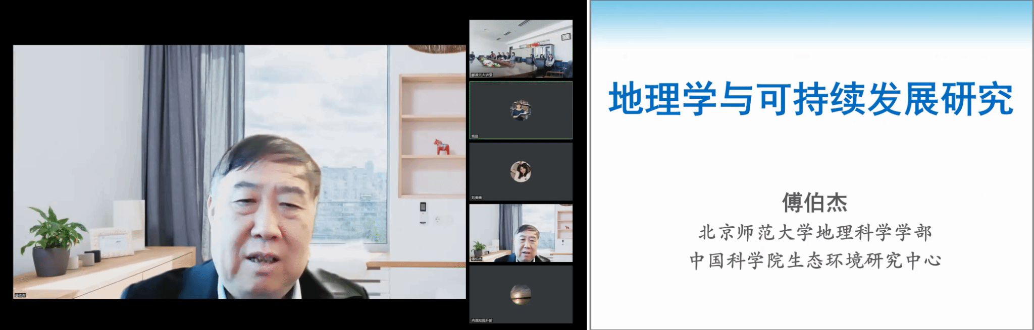 本次学术讲座的主题为《地理学与可持续发展研究》,在全球可持续发展目标及安全公正空间理论的基础上,系统介绍了新时代地理学的学科具有交叉性、区域性和综合性的特征。傅院士指出,地理学的研究目标不仅在于解释过去,更重要的在于服务现在和预测未来;地理学的研究主题也从多元走向系统,强调以地球表层系统、尤其是人地系统的研究为重点,分析和理解全球变化背景下当今人类社会可持续发展面临的重大问题。人地系统动力学是解析区域可持续发展的关键,地理学理论对可持续发展具有支撑作用。在此基础上,傅院士对本主题核心问题的前沿领域进行了系统而深入浅出、详实又通俗易懂的讲解,介绍了“格局-过程-服务-可持续性”框架下其团队的最新研究成果。傅院士强调,可持续发展是解决全球问题的金钥匙,地理学是可持续发展的基础性学科,可持续发展是地理科学的历史任务。