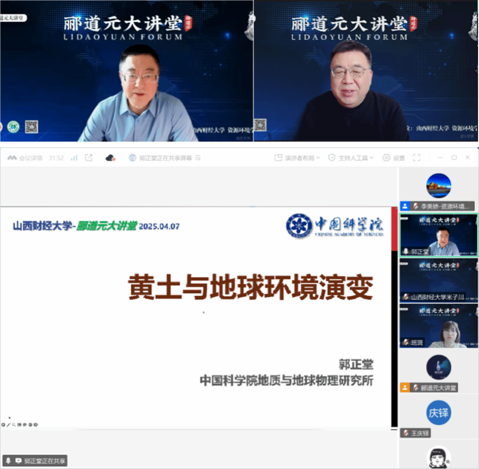 2025年4月7日上午,太阳集团tyc33455主办的“郦道元大讲堂”第十三期如期开讲,应太阳集团tyc33455院长邀请,中国科学院院士、发展中国家科学院院士、国家自然科学基金委员会地球科学部主任郭正堂院士为我校师生作了题为“黄土与地球环境演变”的线上学术交流报告。校党委常委、副校长米子川教授出席并致辞。来自太阳集团、山西大学、山西师范大学、太原师范学院等省内高校师生和省外相关单位的地学工作者近200名在线参加了报告会。讲座由太阳集团tyc33455院长班凤梅教授主持。